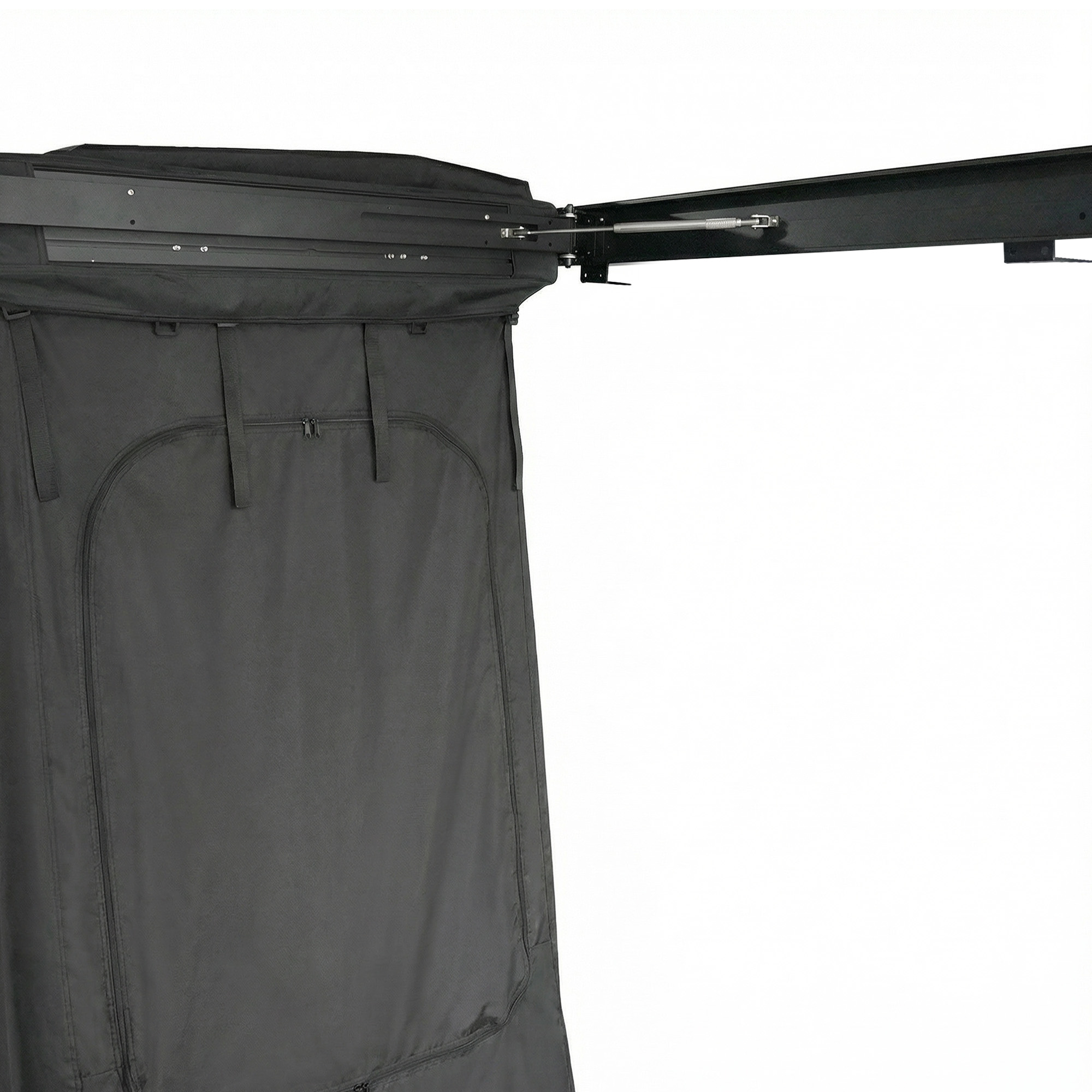 תושבת סיבוב חזקה המיועדת להתקנת אוהל מקלחת לרכב ומאפשרת פתיחה הצידה של האוהל ליצירת מרווח עבודה נוח יותר לצד הרכב.